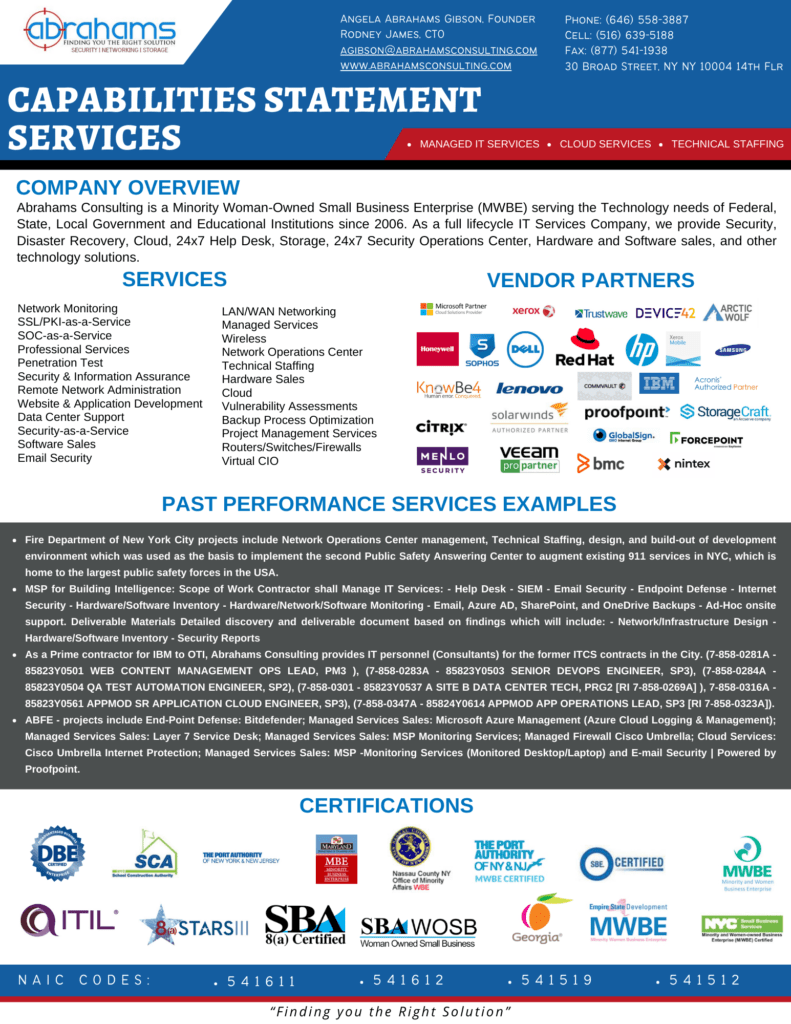 Abrahams Consulting is a Minority Woman-Owned Small Business Enterprise (MWBE) serving the Right Solutions needs of Small, Medium and Enterprise businesses since 2006. As a full lifecycle IT Services Company, we provide Security, Disaster Recovery, Cloud, 24×7 Help Desk, Storage, 24×7 Security Operations Center, Hardware and Software sales, and other tech solutions.
