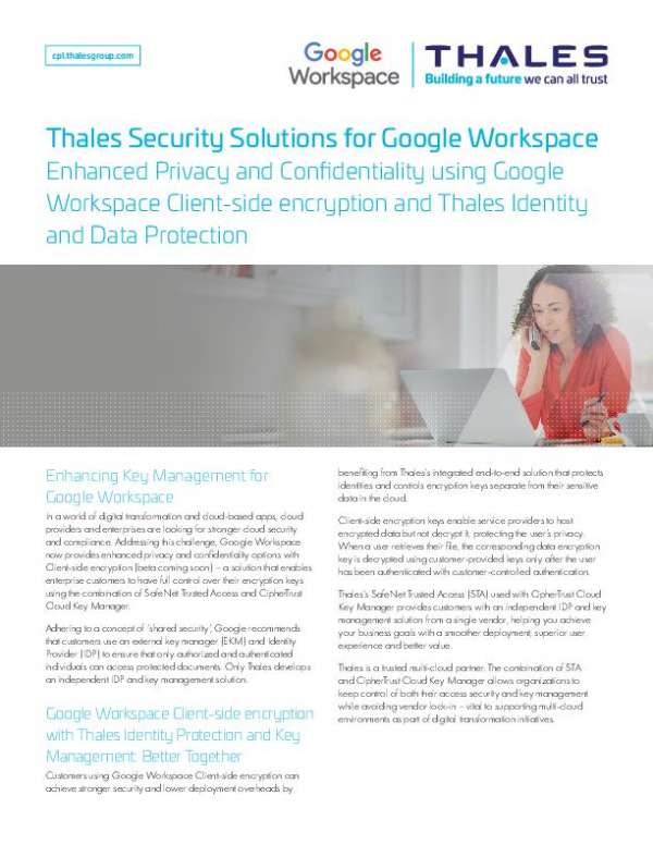 Read the solution guide to learn how Thales unique independent IDP, authentication and key management solutions can enable your organization to meet cloud security best practices and secure Google Workspace with client-side encryption.