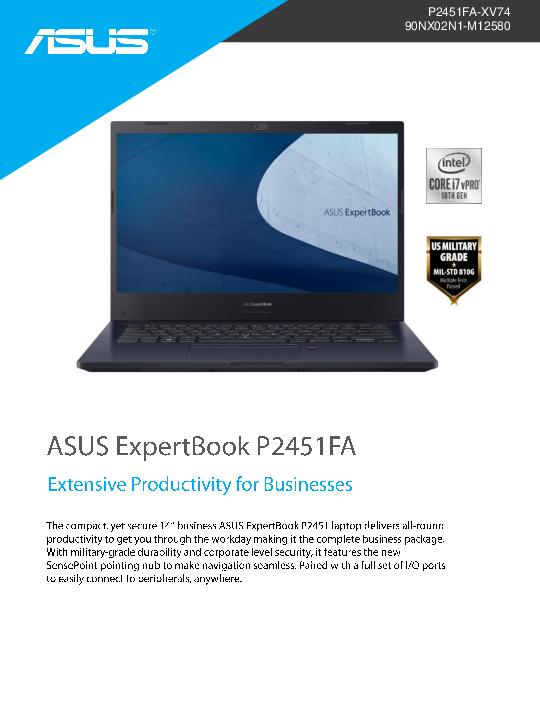 The compact 14″ business ASUS ExpertBook P2451 laptop is the complete business package. You can count on it to deliver the productivity your employees need to get through the workday. Built with military-grade durability and corporate level security, the ASUS ExpertBook P245 features the new SensePoint pointing nub for seamless navigation and a full set of 1/0 ports for easily connecting to peripherals anywhere.