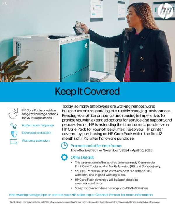With more employees working remotely in your rapidly changing business, keeping office printers up and running is essential. To provide you with extended service and support options, HP is extending the timeframe to purchase an HP Care Pack within the first 12 months of an HP printer hardware purchase until April 30, 2025. Download the Keep it Covered flyer for offer details.