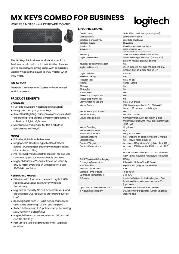 This datasheet lists the benefits of the Logitech MX Keys Combo for Business keyboard and mouse and provides an overview of the solution’s technical specifications. Please contact Abrahams Consulting LLC for more information about the Logitech MX Keys Combo for Business.