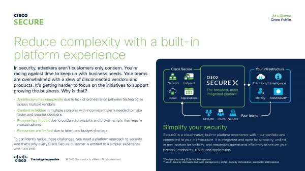This at-a-glance document describes Cisco SecureX: a cloud-native, built-in platform experience within the Cisco portfolio that’s connected to the user’s infrastructure. It also explains how SecureX is integrated and open for simplicity, unified in one location for visibility, and maximized for operational efficiency to secure the user’s network, endpoints, and applications. For more information about Cisco SecureX, please contact Abrahams Consulting LLC.