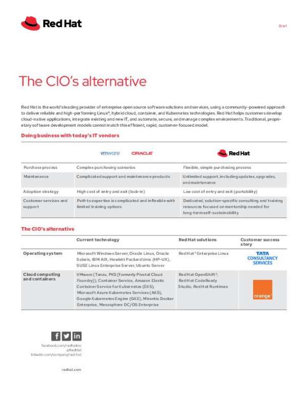 Red Hat uses a community-powered approach to deliver reliable and high-performing Linux®, hybrid cloud, container, and Kubernetes technologies. Read the solution brief to learn how Red Hat helps customers develop cloud-native applications, integrate existing and new IT, and automate, secure, and manage complex environments.