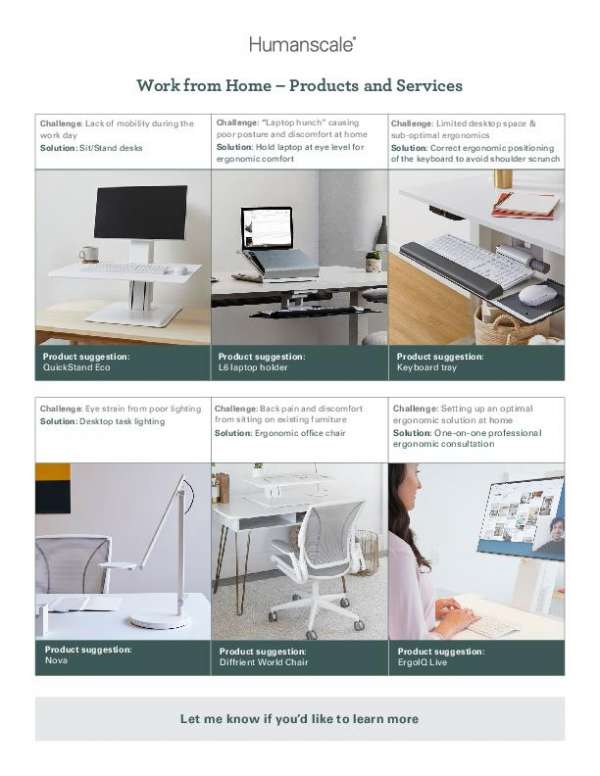 This solution brief runs down Humanscale’s work-from-home product and service solutions, highlighting typical remote work challenges and how each product solves that challenge.