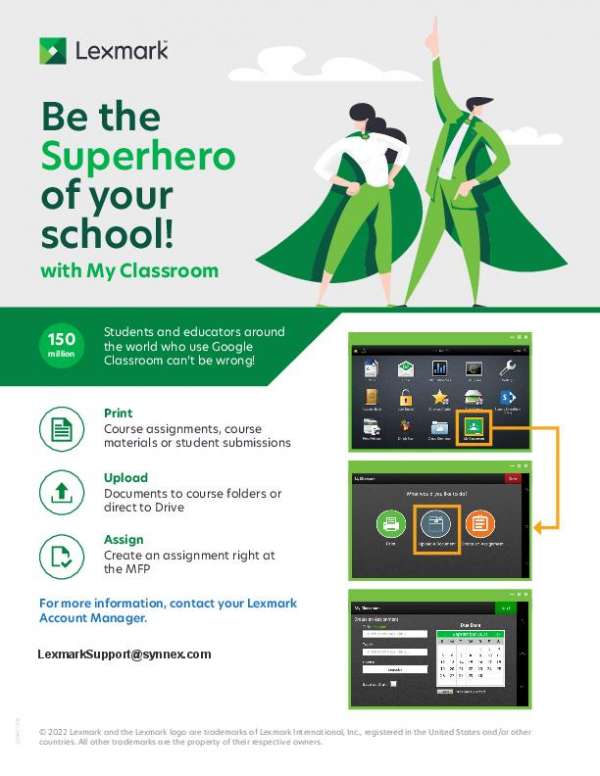 Students and educators around the world who use Google Classroom can’t be wrong! Find out how a Lexmark MFP with Google Classroom can turn you from an awesome educator into a classroom superhero. Check out the details in the brochure, then get in touch with Abrahams Consulting LLC to unleash your superpowers with Lexmark and Google Classroom.