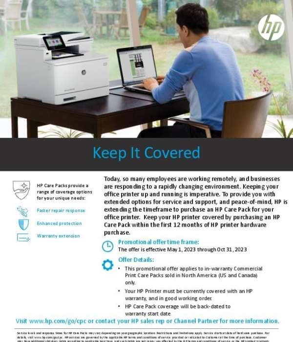 With so many employees working remotely, keeping your office printers up and running is imperative. To provide you with extended options for service and support, HP is extending the timeframe to purchase an HP Care Pack for office printers until October 31, 2023. To gain peace of mind, keep your HP printer covered by purchasing an HP Care Pack within the first 12 months of an HP printer hardware purchase. Download this solution brief for offer details.