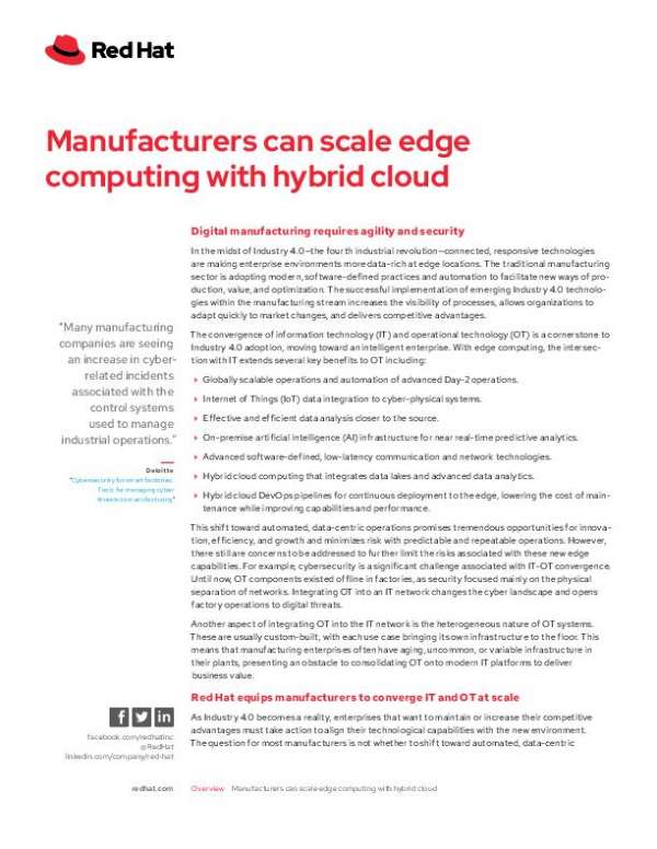 Take a deep dive into digital manufacturing including the challenges of merging information technology (IT) and operational technology (OT) and the benefits of hybrid cloud computing. With a focus on security and efficiency, this brief offers stakeholders an in-depth look at the possibilities and proven performance of Red Hat’s portfolio in the manufacturing sector. Download the brief.