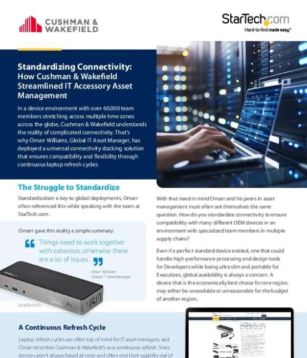 Cushman & Wakefield transformed its IT environment with a universal docking strategy that improved performance and simplified support across 60,000 global users. This customer story highlights how GPU-agnostic StarTech.com docks future-proof refresh cycles, eliminates compatibility issues, and reduces downtime. Read the story to see how your organization can benefit from standardized connectivity, then contact Abrahams Consulting LLC to discuss implementation.