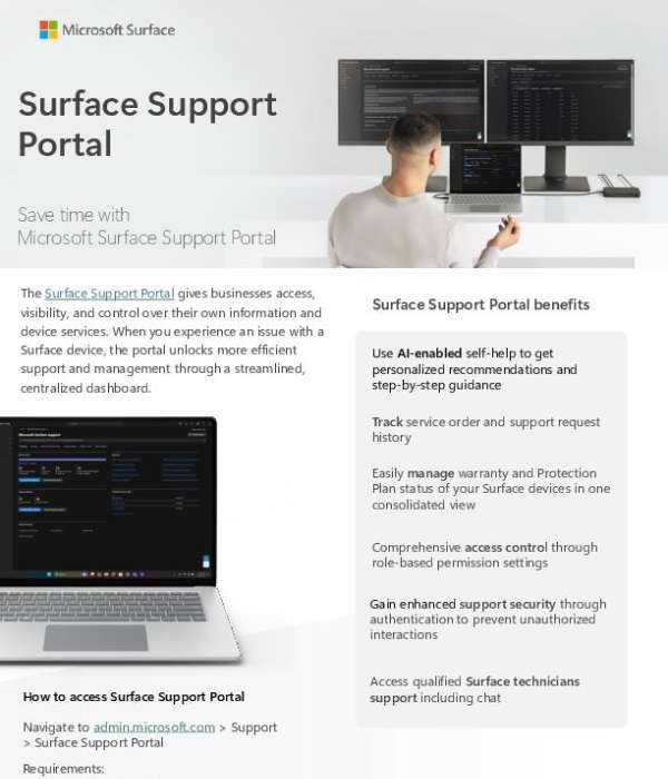Time is the most valuable asset in any business, and Microsoft helps you save it with the newly streamlined dashboard of the Surface Support Portal. The dashboard gives businesses comprehensive access and control over their device services – from tracking service order history to managing warranty and protection plan status of your Surface devices in one unified view. It is armed with AI-enabled self-help for personalized recommendations and step-by-step guidance. Plus, your information and device services are kept secure with enhanced support and authentication systems preventing unauthorized interactions. The Surface Support Portal provides a new dimension to how businesses can reimagine their tech-support approach. For more information on this new Surface Support Portal and to order the latest Surface AI-enabled devices, contact us today.