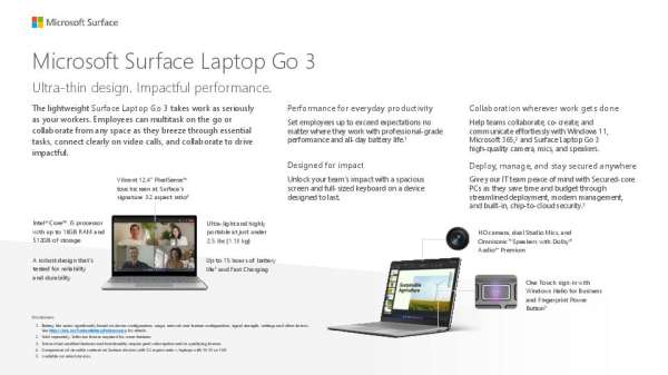 Introducing the Microsoft Surface Laptop Go 3, an ultra-thin laptop packed with robust Intel Core i5 power and the innovative features of Windows 11 Pro guaranteed to reimagine your work experiences. Notable for its lightweight design, it allows employees to multitask on the go, ensuring high levels of productivity alongside clear video calls and fruitful collaborations. Under the hood, it boasts a robust Intel Core i5 processor, up to 16GB RAM and 512GB of storage, assuring reliable performance. Enjoy stunning visuals with a vibrant 12.4″ PixelSense touchscreen at Surface’s signature 3:2 aspect ratio. Enhance your collaboration with Windows 11 Pro, Microsoft 365, and high-quality camera, mics, and speakers. Contact us today to order yours!