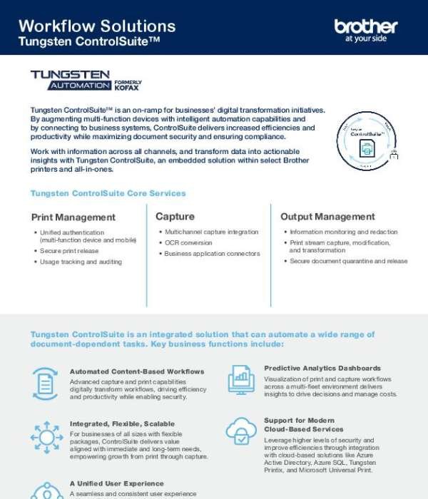 Manual document handling drains time, increases risk, and slows productivity. This brochure introduces Tungsten ControlSuite, an embedded workflow automation solution that brings together secure print release, OCR-enabled capture, and output management in one interface. Download the brochure to see where automation fits into your customer’s goals, and contact Abrahams Consulting LLC to discuss implementation options.